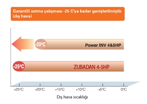 Zubadan serisi ünitelerde -25 °C dış hava sıcaklığında dahi verimli ısıtma yapabilme